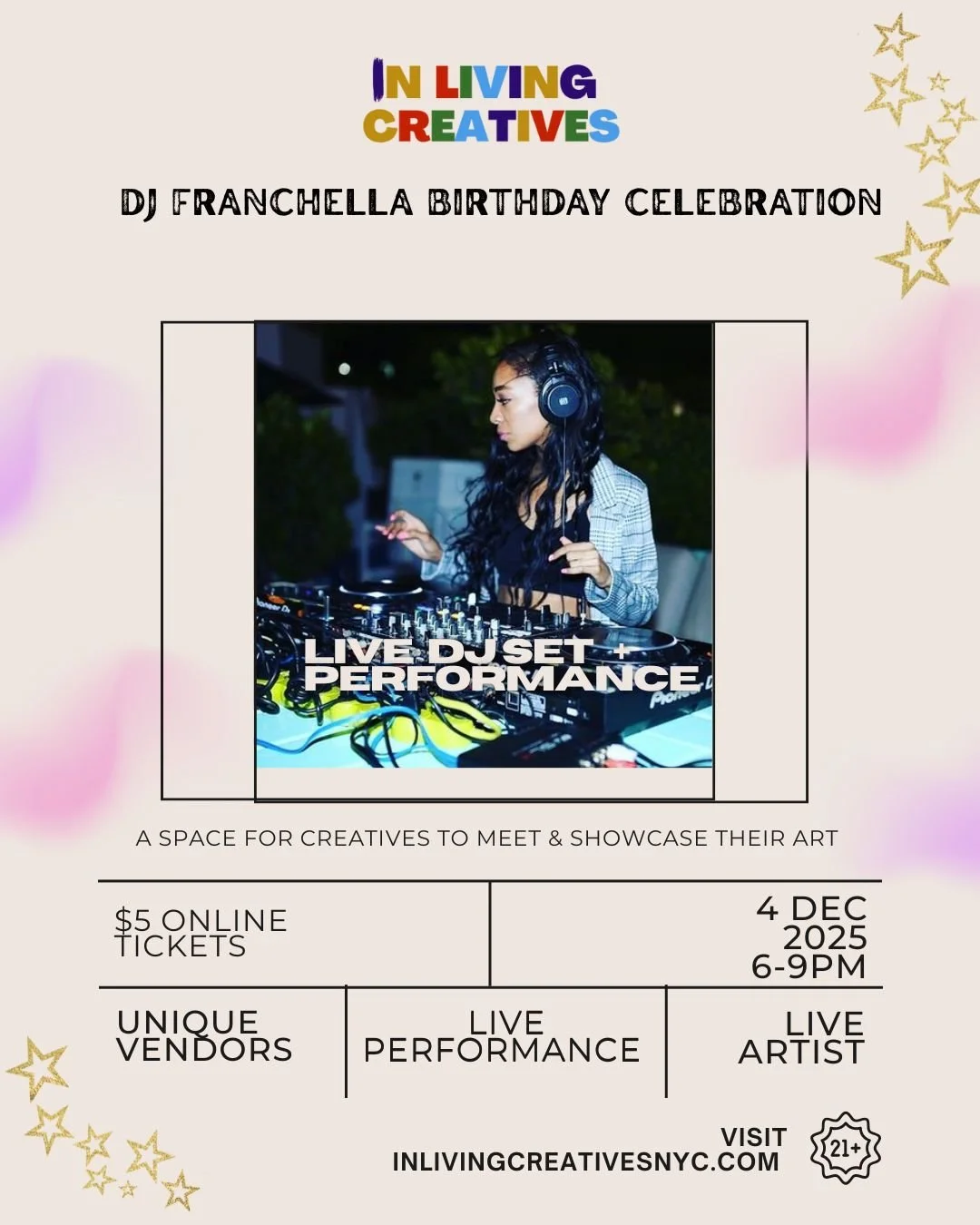 DJ, educator, and event curator, among other things, Frances Harris is better known around New York City as DJ Franchella. Curator of some of NYC’s most creative and highly anticipated events, DJ Franchella’s passion to promote art & culture ranks just as high with her passion to rock a party.